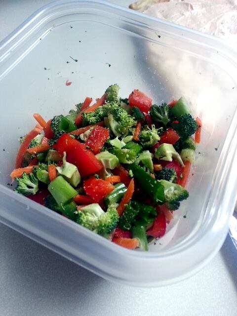 - broccoli, red pepper, green onions, spinach, shredded carrots (all chopped and mixed together)