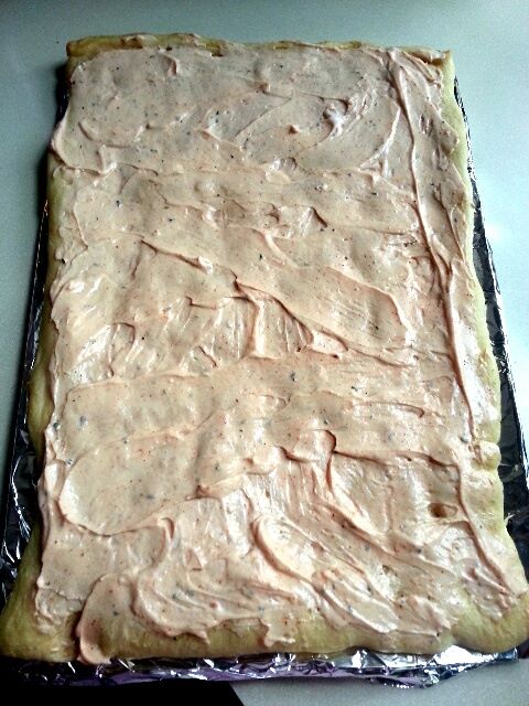 After cooking the seamless croissant dough for 10 minutes, I topped it with the mixture of greek yogurt, cream cheese, and 1/4 of the spicy ranch seasoning packet.