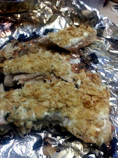 We took a large steel-head fillet and seasoned it with salt and pepper. Then, we covered it in melted chive and onion cream cheese, which was then topped with crumbled Bacon flavored Ritz crackers. Yes, BACON crackers. I didn’t even know they existed! We grilled the fish for about 15-20 minutes, checking to see when it began to flake.