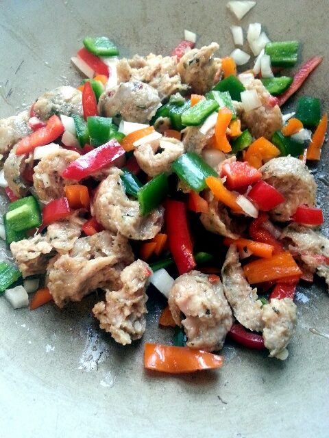 After I chopped all the veggies, I put them in a saute pan. I then removed the casing on the sausage and broke it into smaller pieces. I didn’t need to add any oil to this because the sausage had plenty of natural oils to cook the veggies. I continued to break the sausage into smaller pieces as it cooked. At the last minute I decided to add some garlic powder. I have a strong belief that garlic makes everything better! I used about 1 teaspoon, and stirred it in with everything.