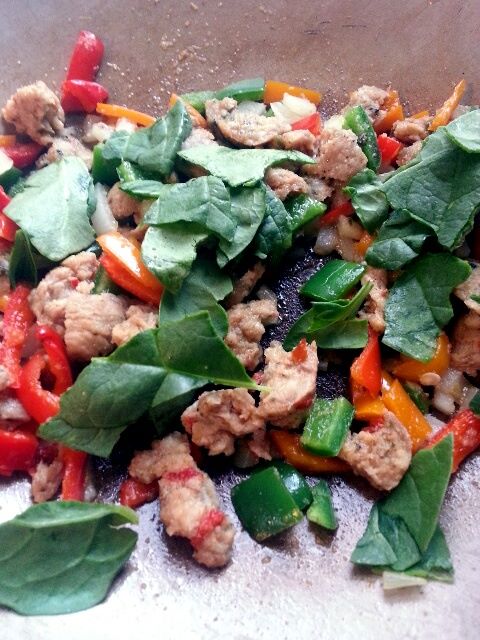- Once sausage and peppers are done, add in spinach. Mix well. Cook just until spinach is wilted.