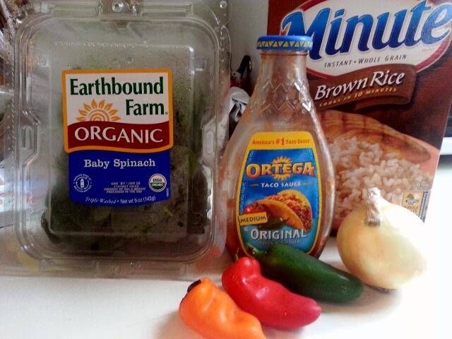Once the spinach is wilted, remove the skillet from the heat. Meanwhile, stir taco sauce into cooked rice. I only used about 1 teaspoon, because I didn’t want it to be heavily sauced. I just wanted enough to add a little flavor and to add some moisture to the rice.