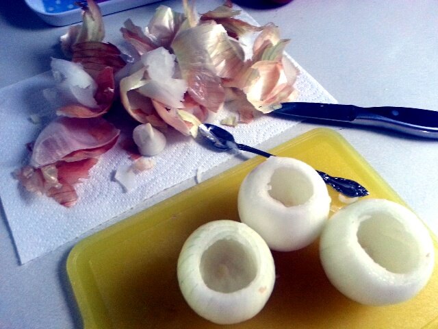 - Slice ends off of onion, and peel. Use a small spoon to scoop out the insides of the onions. Careful not to poke through to the bottom!