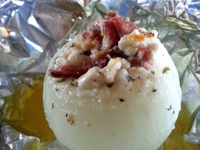 - Mix together Olivio, feta cheese, bacon, garlic powder, parsley, salt, and pepper