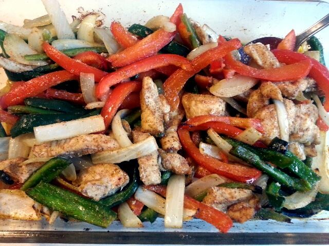 - Pour fajita marinade over vegetables and chicken, mix together well.