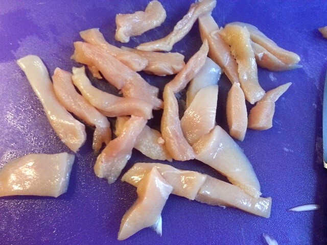 - Slice chicken into long bite-size pieces, making sure to trim any excess fat. Combine with vegetables in bowl.
